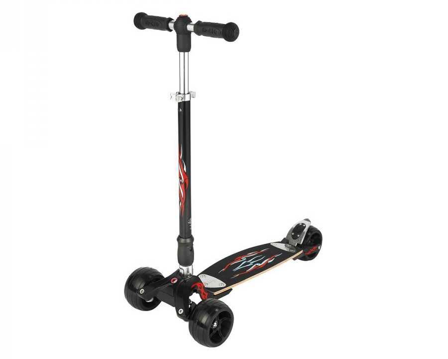 Этот самокат рассчитан на ездоков от 8 лет и выдерживает он вес в 100 кг. Дека здесь изготовлена из стекловолокна и дерева, что вкупе с амортизаторами делает езду на нем комфортной по любым поверхностям. Колеса этого самоката резиновые, диаметром 200 мм, есть съемное крыло и два тормоза – ручной и ножкой. Устройство складное, руль регулируется от 73 до 102 см. вес – 5,2 кг.