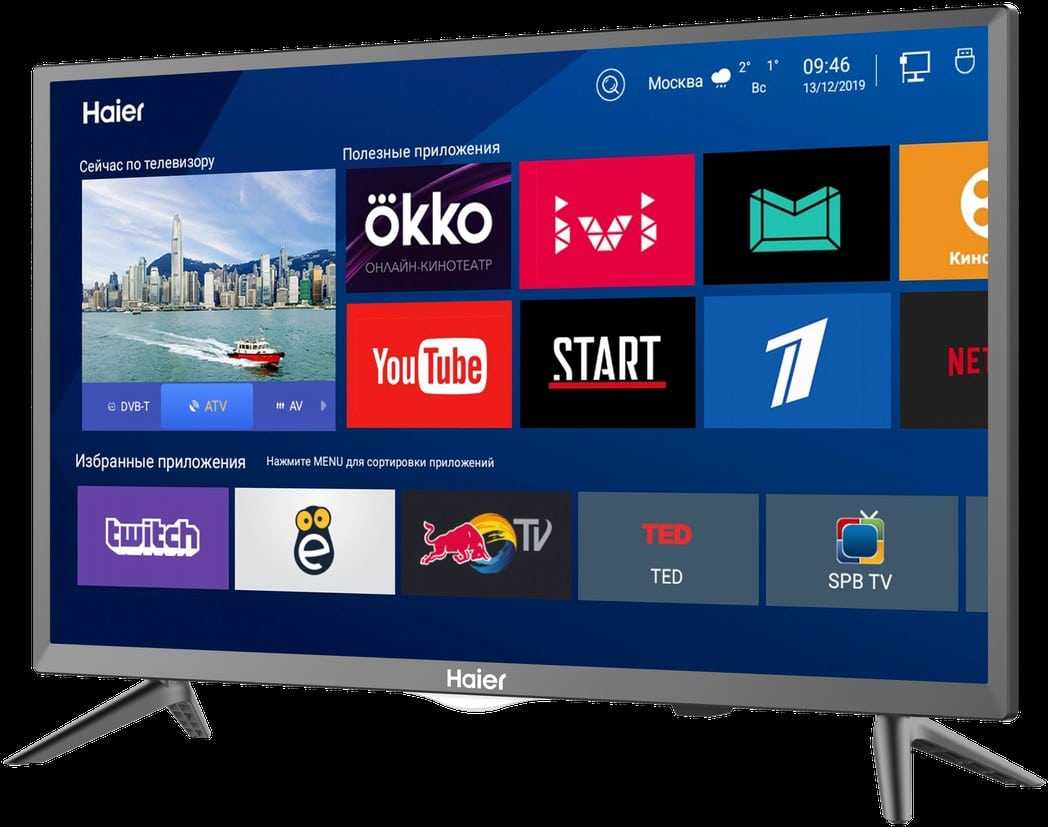 Новинка от компании Haier получила стильный дизайн, HD матрицу с поддержкой HDR и обновлением 60 Гц. Полный набор тюнеров, кодеков, блокировка от детей, таймер, запись на флешку, TimeShift. Выходы: оптика, аудио 3,5, RJ-45, 2 HDMI, RGB, 2 USB. Телевизор получил смарт функции – подключение осуществляется по Wi—Fi. Операционная система – Android. Громкость динамиков 6 Вт, AVL. Цена: 12 000 рублей.