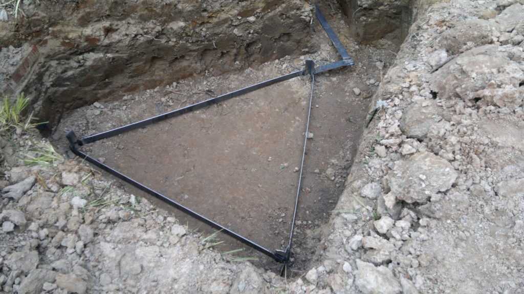 - с помощью лопаты прокопайте равносторонний треугольник (длиной каждого ребра около 1,2 метра и глубиной борозды от 0,5 до 0,7 метра);