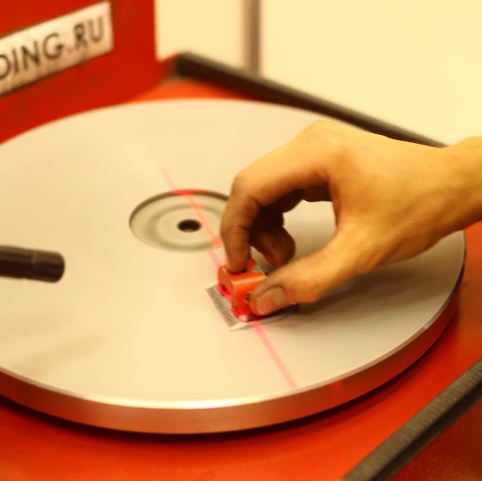 Получается, два мастера могут затачивать, оккупировав обе стороны. Принцип прежний, удержать вертикально нож не представляется возможности, поэтому придуман специальный «журавль», придерживающий — цепко — деталь. Процессу предшествует настройка. Помогая точнее навести внешнюю кромку зубьев по радиальной линии, на крепежный конец «журавля» помимо ножа надевается тонкая пластиковая линейка. Срединная прорезь как раз должна указать на центр диска. Предусмотрены подстроечные механизмы на винтах во всех направлениях. Как только гайки затянуты, линейка снимается, одевается нож, станок готов точить.