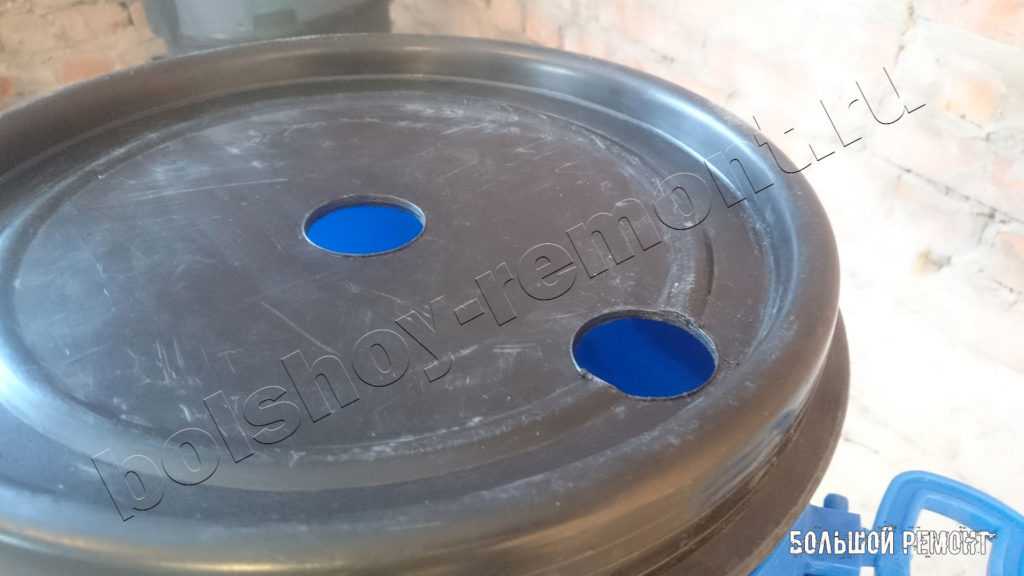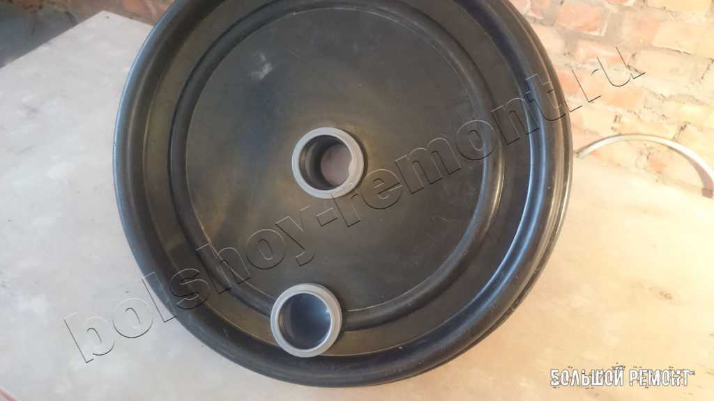 Первым делом по центру крышки ведра высверливаете или аккуратно вырезаете сквозное отверстие под трубку.