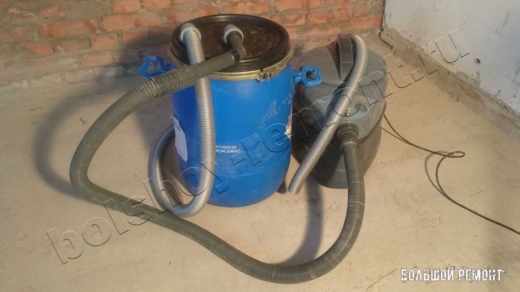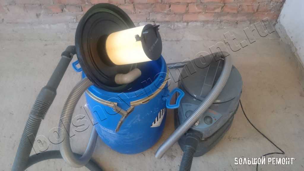 Если у вас мощный пылесос, вместо пластикового ведра из под эмульсионной краски, лучше использовать металлический бачок такой же формы. Иначе ведро будет схлопываться и его будет плющить.