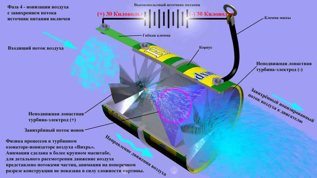 Проходя через коронный электрический заряд, который появляется вследствие подачи напряжения на электроды, частицы превращаются в отрицательно заряженные. В свою очередь, молекулы кислорода, микроорганизмы и частицы в воздухе получают отрицательный заряд. Чтобы воздух в квартире шел через коронный разряд все время, ионизатор необходимо обеспечить вентилятором.