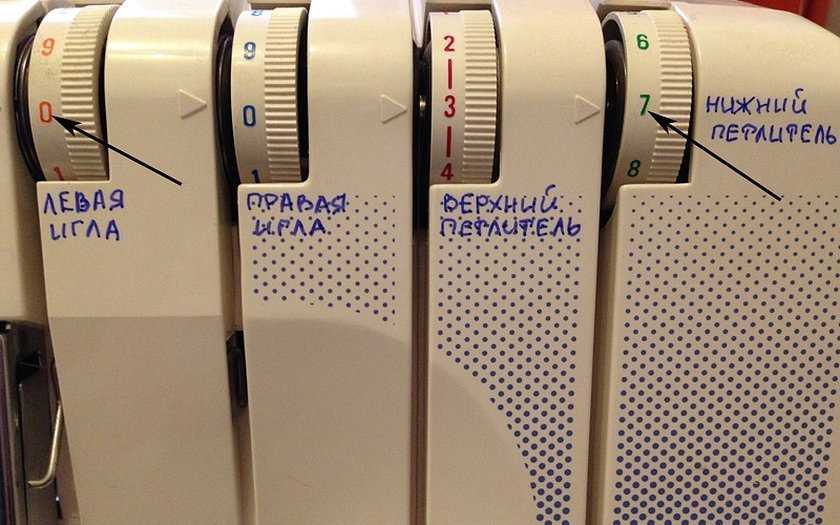 Вот так как показано на этом фото. Да, обязательно отключите верхний нож, поскольку обрезать ткань нельзя. У старых моделей оверлоков он оттягивается влево и затем поворачивается вверх (на себя), у новых — опускается вниз.