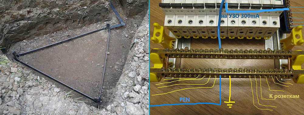 От этого контура приваривается заземляющий провод и проводится в дом. Подключается к шине PE. И далее уже распределяется методом разветвления проводом земли по всему дому. Провода должны идти на выключатели, розетки и так далее.