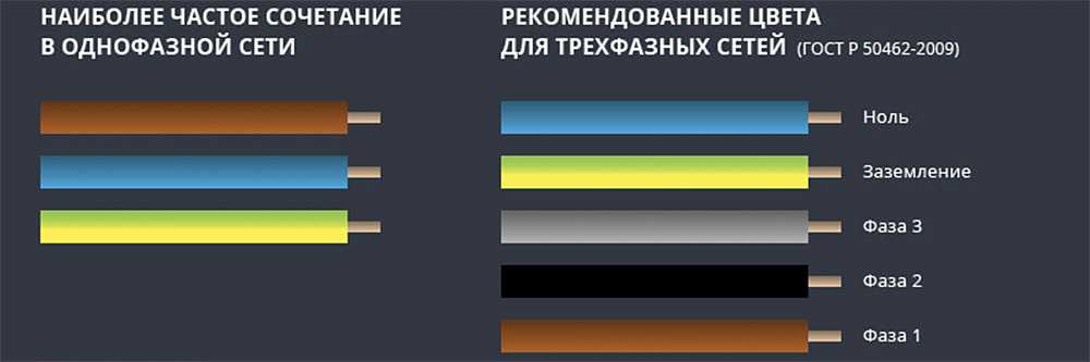 Сейчас используются разноцветные провода. Это сделано не только для удобства, но и для безопасности. Обычно применяют такие решения: