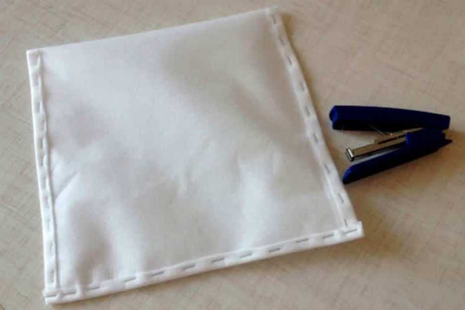- Края сложенной ткани нужно закрепить, оставив лишь один «вход». Закрепить можно при помощи степлера или же прошить крепкой нитью. В результате получается мешок-заготовка. Выверните эту заготовку на изнаночную сторону, чтобы швы оказались внутри мешка.