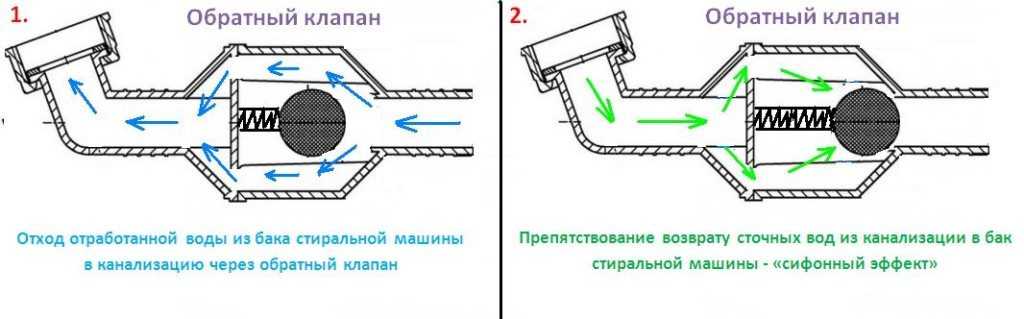 Обратный клапан пропускает воду в одном направлении, и предотвращает движение в противоположном. Препятствует «сифонному эффекту» и в основном защищает от запаха канализации. Для стиральных и посудомоечных машин применяют два типа: