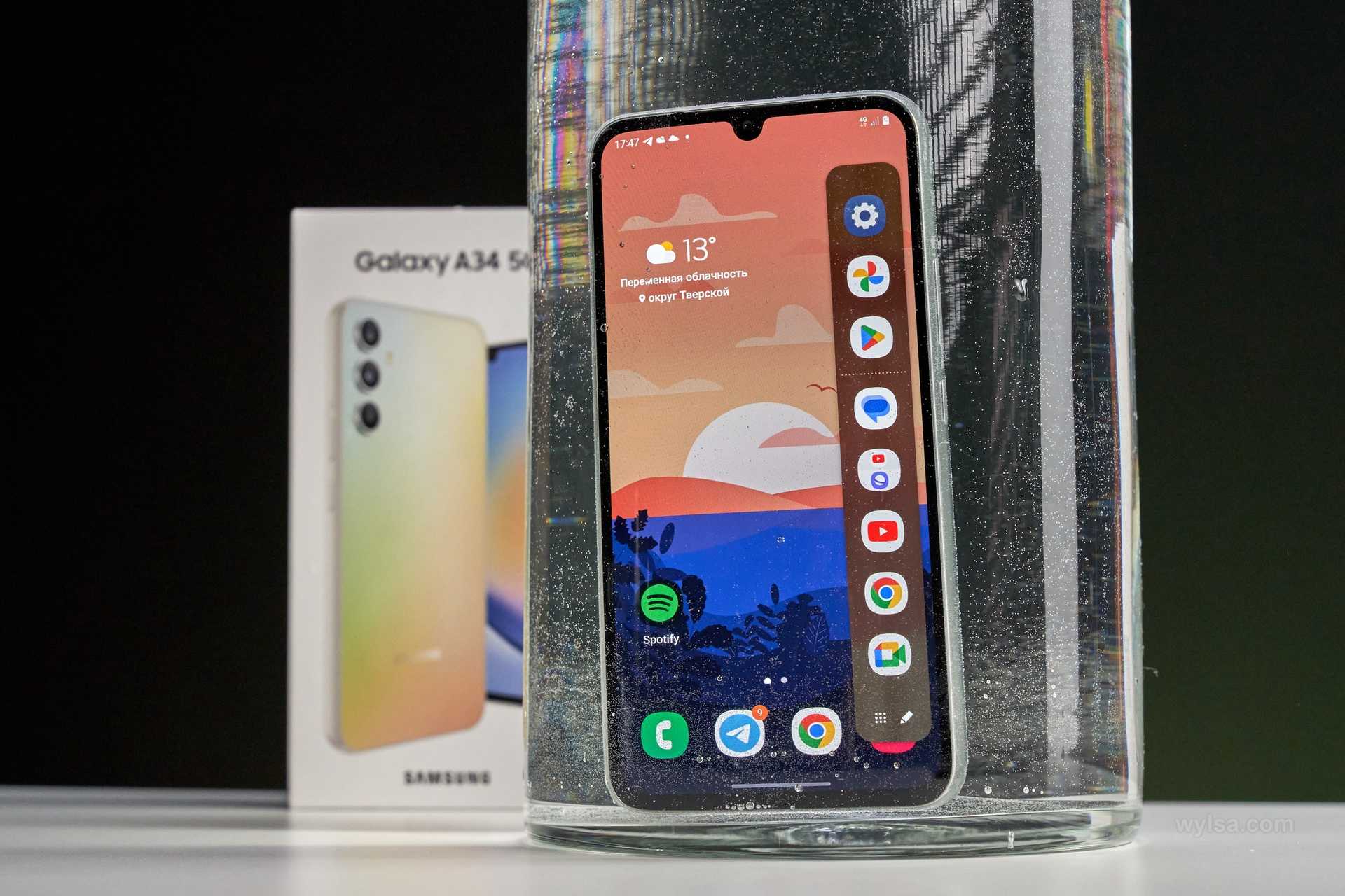 Весьма приятный момент — защита от пыли и влаги по уровню IP67. Купаться в солёной воде со смартфоном в руке, конечно, не рекомендуется, но погружение в пресные воды на глубину до метра на полчаса Samsung Galaxy A34 спокойно переживёт.