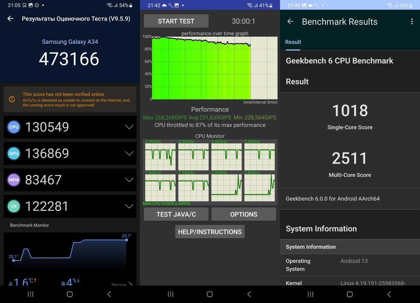 В работе Samsung Galaxy A34 не перегревается, корпус становится тёплым в верхней части во время загрузки данных, но это дело житейское.