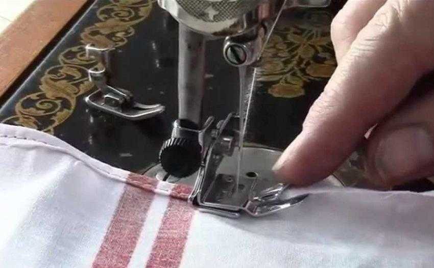 Я поступаю следующим образом — полоску ткани оборачиваю вокруг рукава швейной машинки, нитку пропускаю под этой полоской ткани. Полоска ткани не дает нитке скручиваться в петли.
