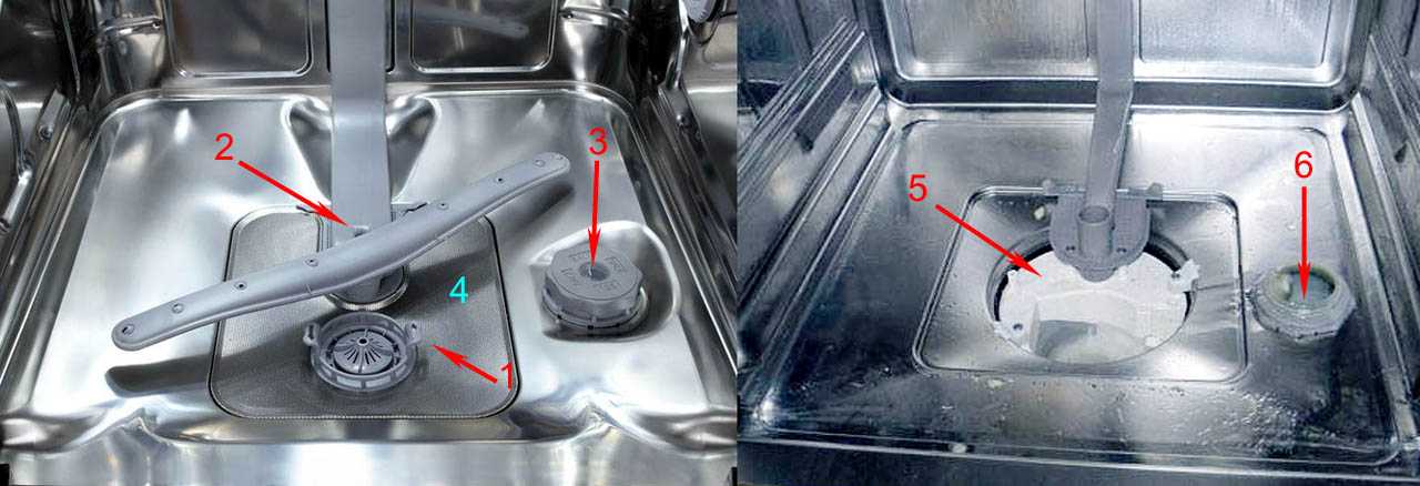 Откройте дверцу своей посудомойки. Вы увидите нечто вроде того, что показано слева на рис. Первое, что тут можно сделать – повернуть по стрелкам и вынуть фильтр ванны 1. Далее, после отвинчивания винта 2 или тоже с проворотом, снимается нижнее коромысло (верхнее аналогично). Справа в моечной камере – регулятор уровня воды, управляющий безо всякой электроники поплавковым клапаном. Ручку установки уровня можно снять, отвинтив винт 3. Когда вынут фильтр и снято нижнее коромысло, вынимается без инструмента поддон моечной камеры 4. Сразу под ним (см. справа на рис.) обнаруживается крышка крыльчатки помпы 5, а при снятой ручке установки уровня воды виден шток поплавкового клапана 6. Его ход можно проверить, надавив пальцем, но для ремонта или зам