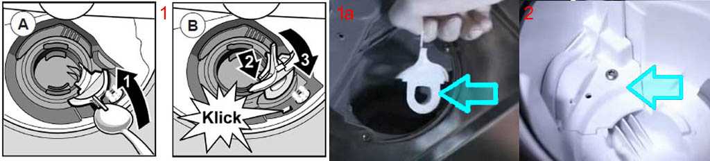 Слабое место данного элемента – крепление крышки. По его конструкции ПММ разделяются на 2 группы: Bosh/Siemens и прочие: Ariston, Candy, Creda, Electrolux, Indesit и др. В машинах клона Аристон/Индезит крышка крыльчатки помпы держится на защелке, поз. 1 и 1а на рис.: