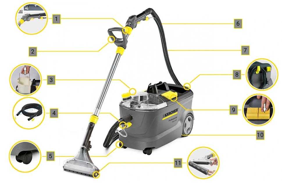 1. Моющий пылесос Karcher SE 3001. Этот прибор и специальное моющее средство способны удалить даже застарелые пятна с ковров. Пылесос является воплощением фирменного дизайна Karcher. Он очень лёгкий и маневренный. Этот пылесос из серии SE задерживает почти 100 % пыли и стоит около 11 тысяч рублей. Такого показателя удалось добиться за счёт технологичной системы из 5 фильтров (как у роботов пылесосов Samsung).