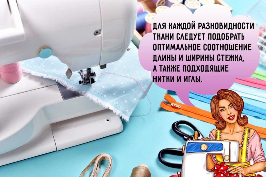 При выборе той или иной разновидности стежка следует ориентироваться на толщину ткани. То есть, чем толще ткань, тем большую длину стежка нужно выбрать.