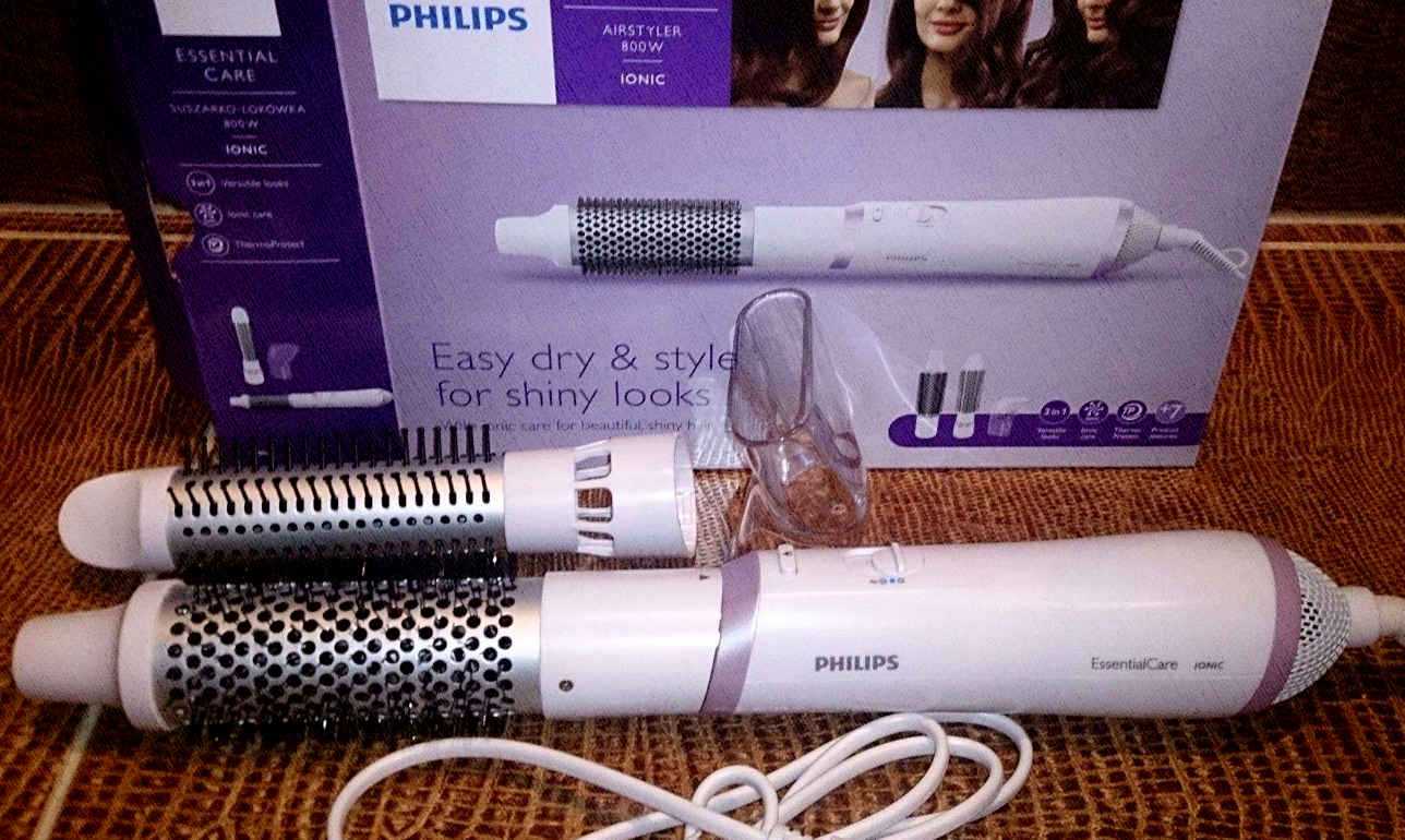 Открывает рейтинг доступная щетка от компании Philips. Она имеет две насадки – щетка с возможностью убрать щетину и концентратор. Модель получила совмещенный переключатель – можно выбрать один из трех режимов, а также отдельно есть ионизация и холодная сушка. Мощность мотора – 0,8 кВт. Длина шнура – 1,8 метра, есть петля для удобства хранения.