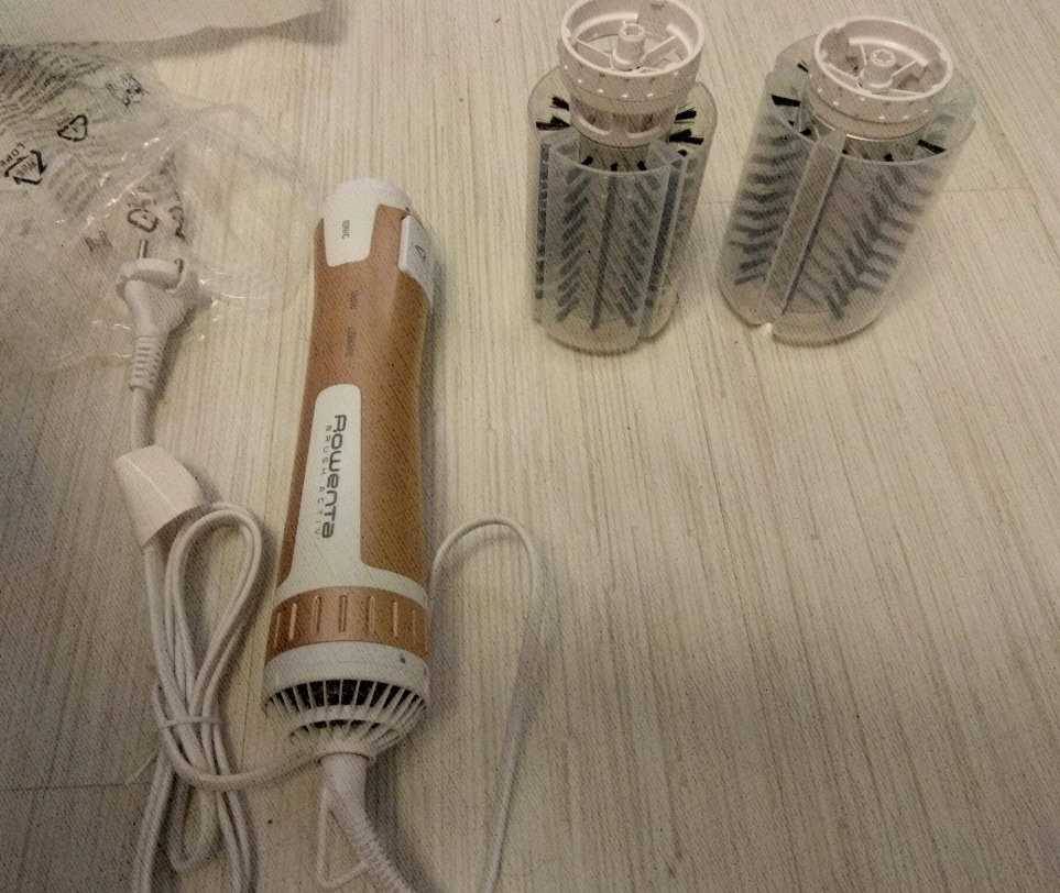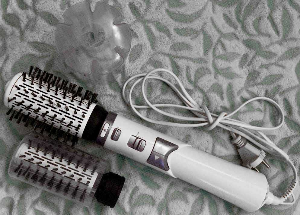 Модель с двумя круглыми насадками разного диаметра, бережно относится к волосам за счет керамических пластин и натурального ворса. Фен-щетка получила 3 температурных режима, 2 скорости обдува и автоматическое вращение. Мощность двигателя – 1 кВт, длина шнура – 1,8 метра, вес – 0,6 кг. Устройство отличается продуманной эргономикой и удобным управлением.