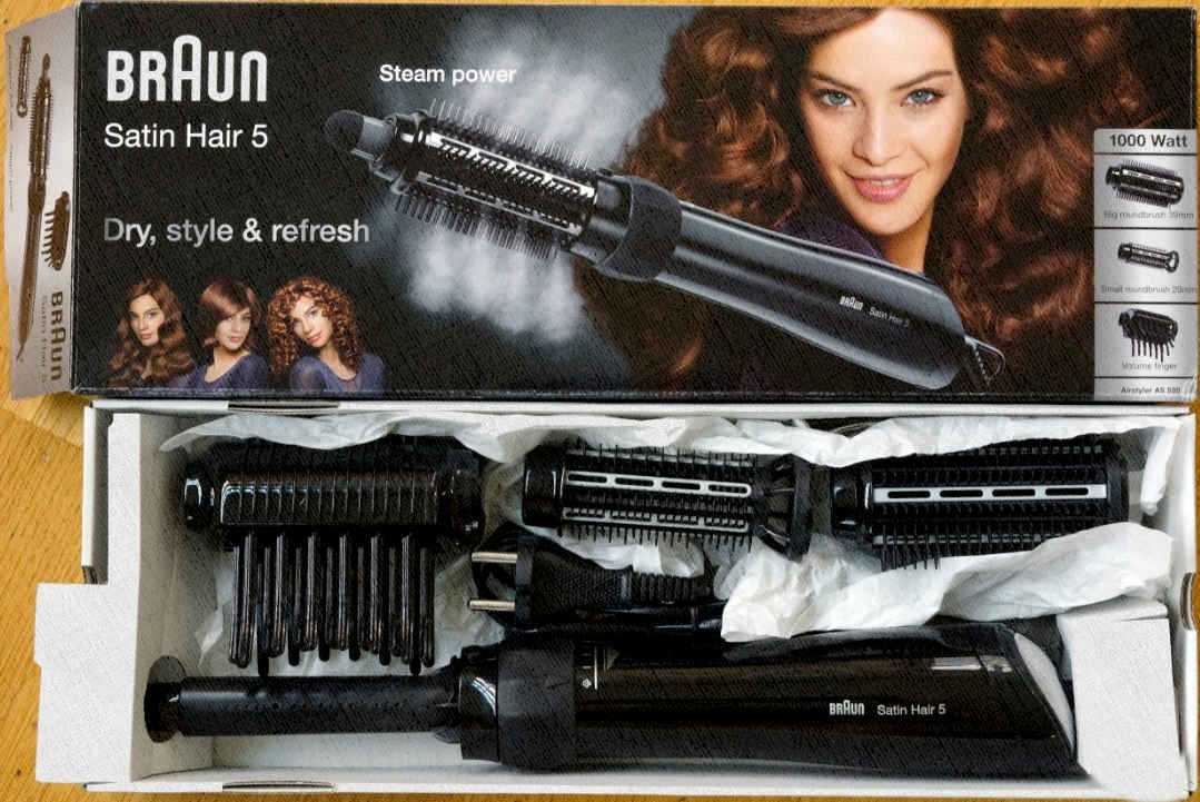 Фен-щетка от Braun получила три насадки – две круглые с разным диаметром и одну насадку-щетку. Есть 3 режима работы, пароувлажнение и холодный обдув. Длина шнура – 1,7 метра, мощность двигателя 1 кВт.