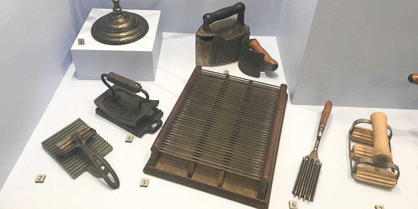 На выставке в «Измайлове» можно увидеть и совсем диковинные утюги, которые появлялись и исчезали вместе с эволюцией костюма. Самый ранний из них датирован концом XVIII века. Каких только приспособлений не придумывали, чтобы ответить на запросы модников разных времен! Инструменты для гофрирования и плиссировки тканей, создания воротников фризе, растягивания перчаток, разглаживания шляп, труднодоступных мест и пуговиц из ткани, прессовки галстуков и формовки декоративных элементов одежды. Есть даже утюг-полировщик с выгнутым днищем, с помощью которого вощили длинные платья аристократок, чтобы материал меньше впитывал уличную грязь.
