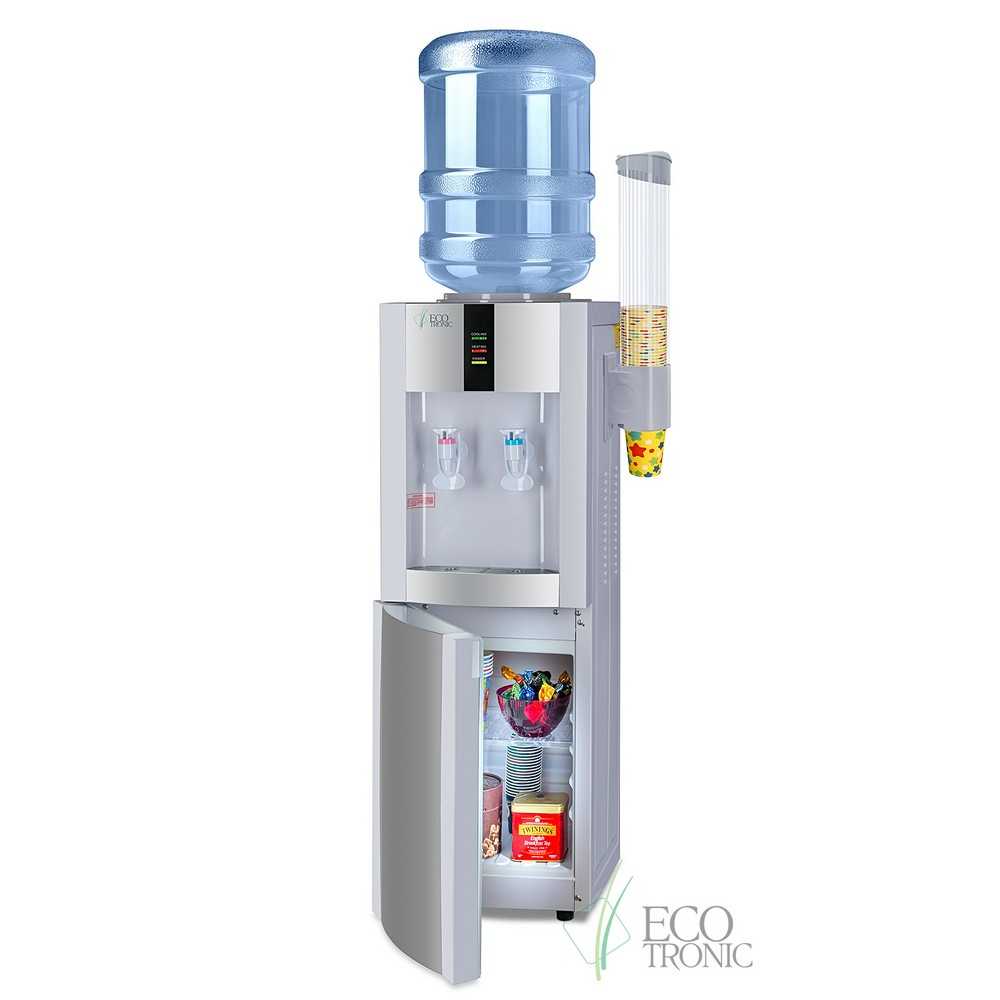 Кулер со встроенным шкафчиком активно приобретается людьми благодаря механическому типу кранов, возможностью нажима на них пластиковым стаканом и функциональности.