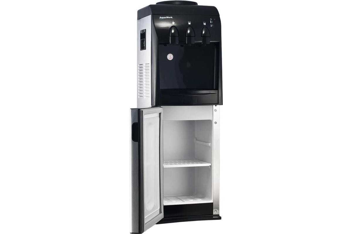Шикарный кулер, оснащенный тремя кранами, дополнительно имеет холодильник, который расположен довольно удобно – в нижней части.