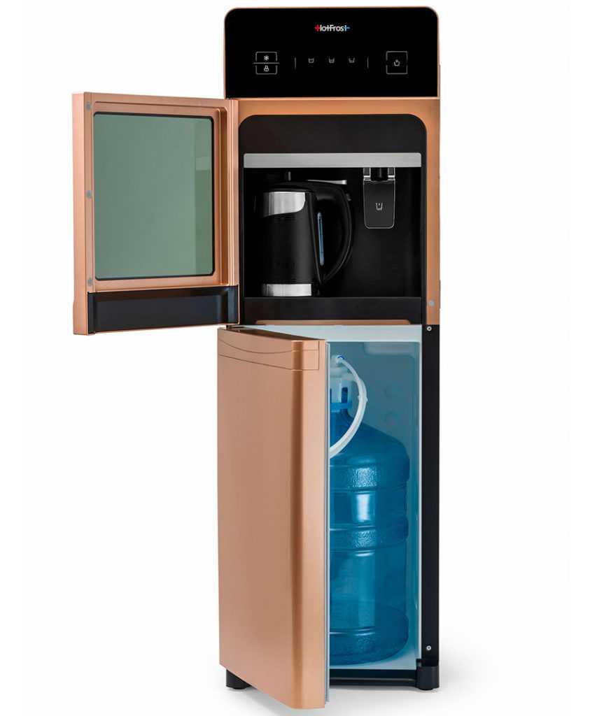 Данный вариант в первую очередь привлекает внимание покупателей тем, что продается в нескольких цветовых вариациях – это очень удобно для размещения в дизайнерских помещениях. Также люди отмечают и другие плюсы: эффективное потребление энергии, бесшумный нагрев и охлаждение, встроенный чайник, сенсорное управление, спрятанная бутыль в нижней части
