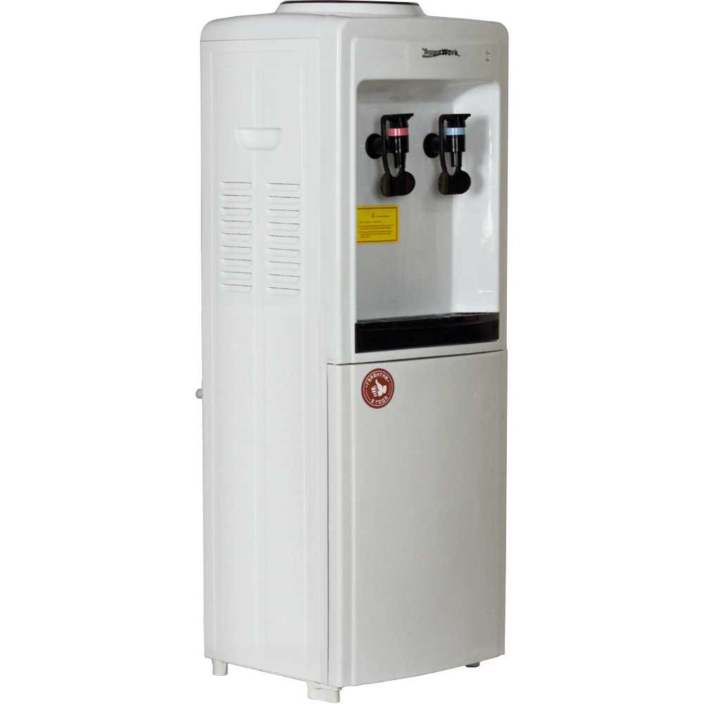 Этот кулер для воды великолепно подойдет для офиса, хотя и дома он закроет большинство потребностей пользователя. Модель практически не имеет недостатков, при этом впечатляет достоинствами. Во-первых, конечно, встроенный холодильник. Он довольно вместительный и очень удобный, в нем можно хранить сливки для кофе, молоко и любые другие продукты, требующие низкого температурного режима. Во-вторых, модель радует повышенной мощностью охлаждения воды, она составляет 120 Вт и позволяет в любой момент получить прохладную жидкость.
