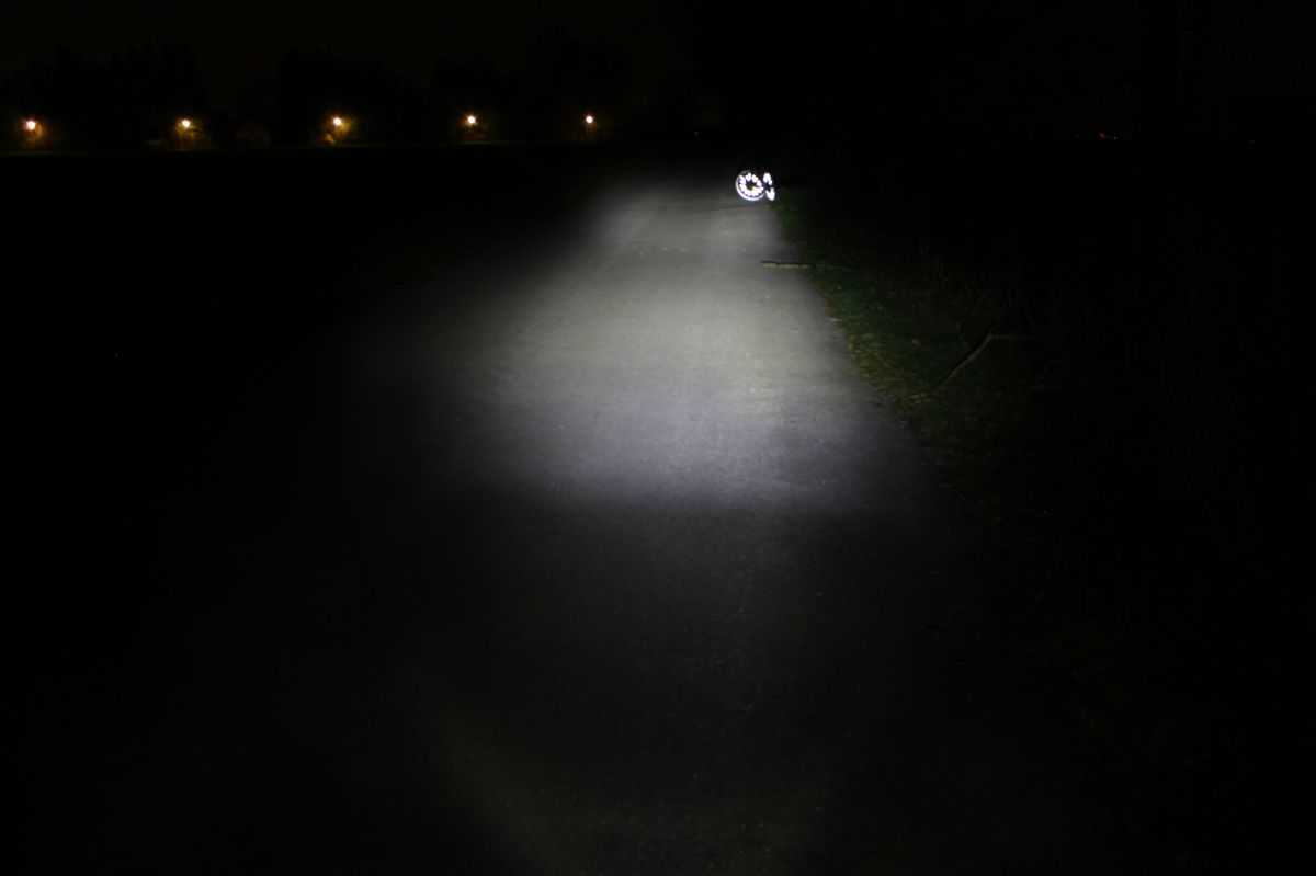 Несмотря на высокий уровень интенсивности света, окрестности эта велофара освещает весьма скромно. Тестовый трек нашему испытателю виден лишь умеренно, а обочины — практически не различимы.