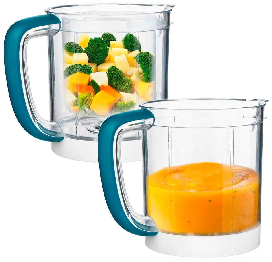 Хороший блендер для детского питания с пароваркой подходит для термической обработки и измельчения пищи, а также для разморозки и подогрева. Его можно выбрать для пюрирования, он позволяет готовить каши и макаронные изделия. Чаша прибора вмещает 800 мл.