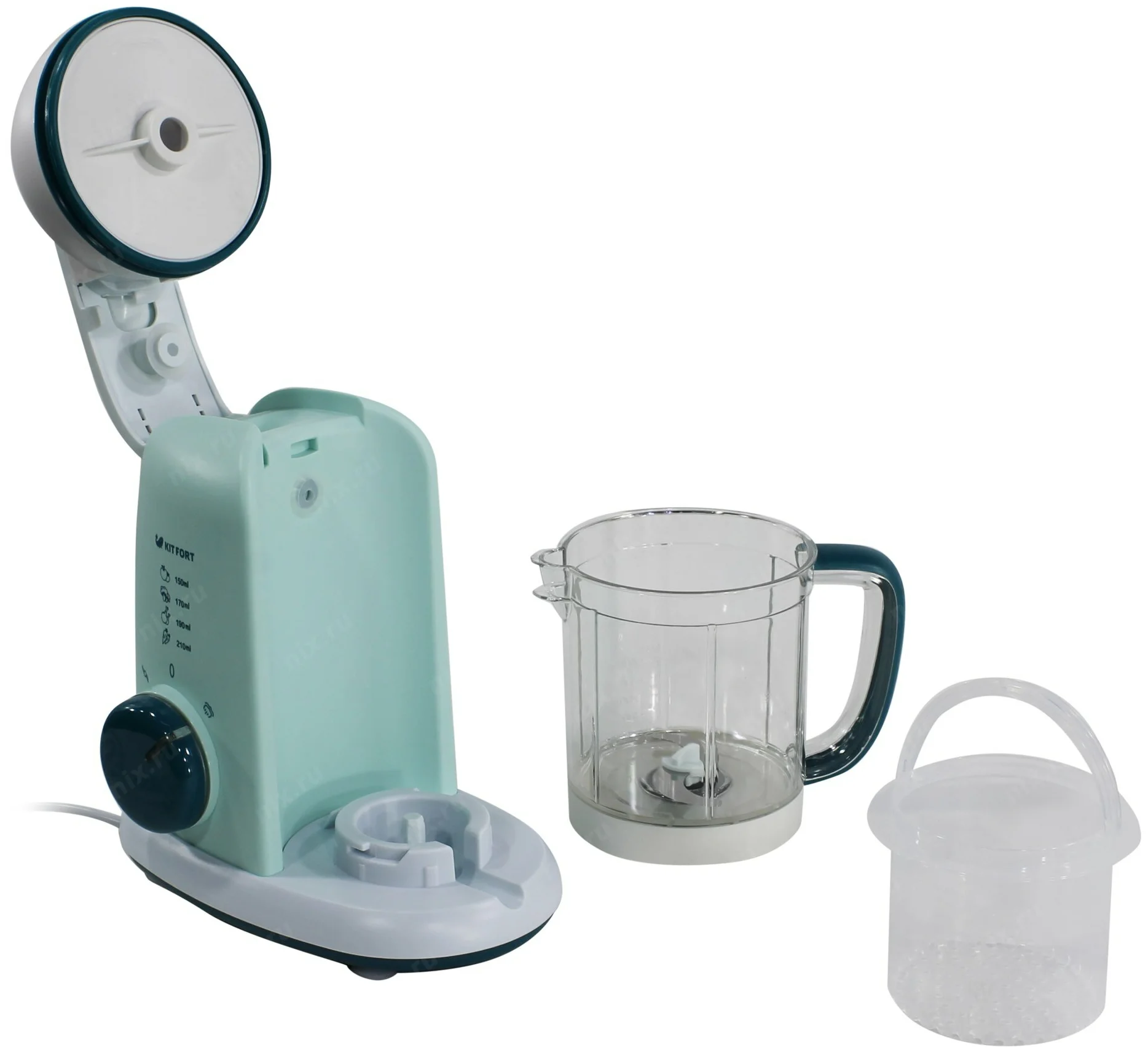 В сравнении блендеров-пароварок для детского питания высокое место занимает агрегат 4 в 1, его стоит выбрать за большой набор дополнительных функций. Пар внутри емкости циркулирует снизу вверх и быстро обрабатывает загруженное сырье в пяти встроенных режимах. Объем кувшина составляет 1 л, что позволяет сделать до четырех порций питания за один цикл.